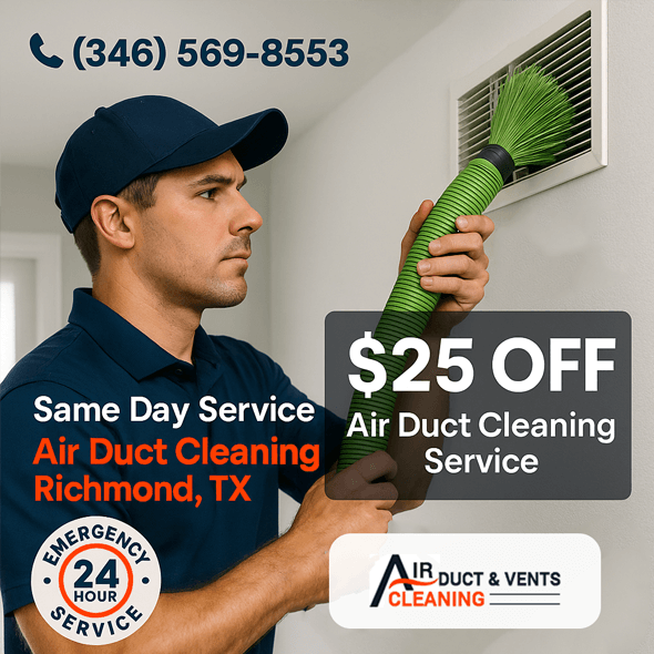 Schedule your air duct cleaning appointment today with Richmond TX Air Duct Vents — enjoy cleaner air, same-day service, and a free estimate!